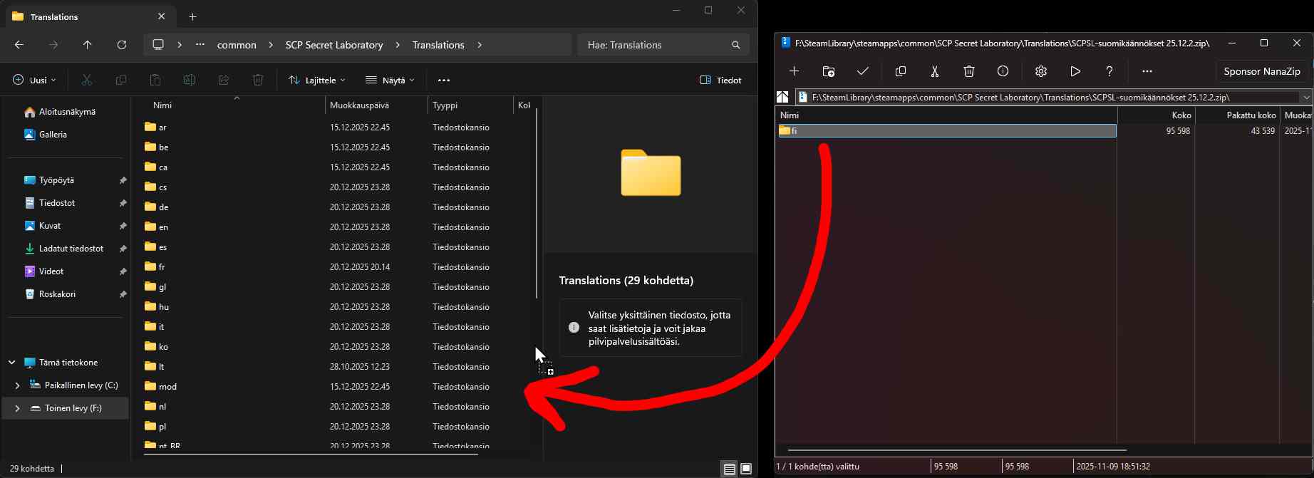 Avaa tältä sivulta lataamasi .zip-tiedosto ja siirrä sen sisällä oleva "fi"-kansio avaamaasi "Translations"-kansioon. Varmista, että "fi"-kansio päätyy samaan kansioon kuin muutkin maakoodikansiot, eikä vahingossa jonkin maakoodikansion sisälle.